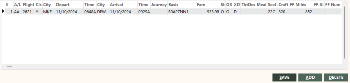 Click ADD to insert a blank row into the Segment screen and enter all the appropriate data for the new segment. Segment number, airline, and both cities are required to save the segment.