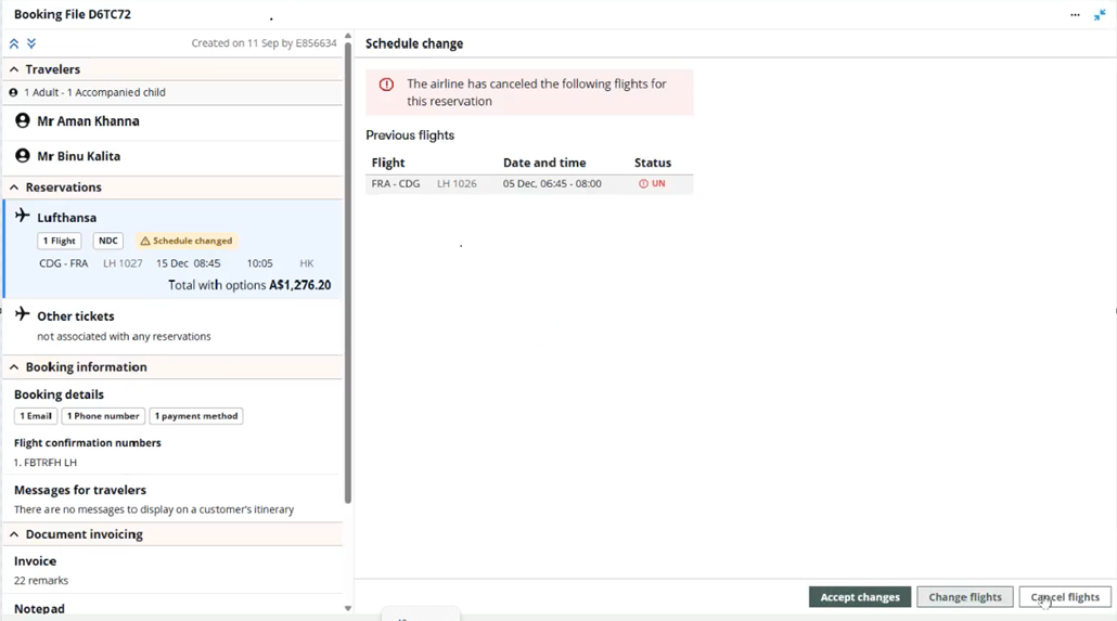 2. The booking file displays with a Schedule changed warning in the Reservation information. Schedule change information displays on the right panel, with UN segment status for the original flight which is no longer operating and TK segment status for the new flight the customer is re-accommodated on.