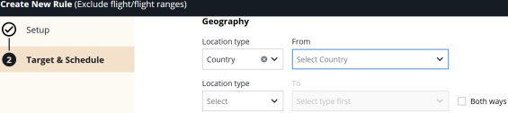 To specify geography exceptions, enter values in the Geography Exceptions fields in the Target and Schedule screen.
