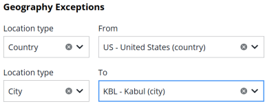 - The From or To fields in a geography exception must either be the same, or more restrictive (granular), than the main Geography in the rule. For example, if the rule's From type is Nation, then the exception's location type must be Nation, City, or Airport.