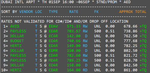The Car Availability gives an overview of rates of car vendors stored in Travelport+. Use CAL to search for car availability. The rates are sorted low-to-high by Approximate Total rate amount.