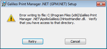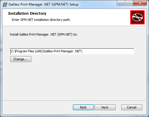 The Installing Galileo Print Manager .NET (GPM.NET) dialog box appears: