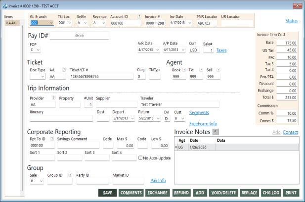 Opens the Segments sceen. This link is displayed for invoice items with A (air) or R (rail) travel types only. See Segments Screen. |