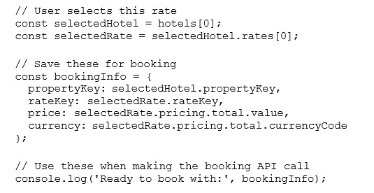 Not saving propertyKey and rateKey: You need both identifiers when making a booking. Save them when the user selects a rate.