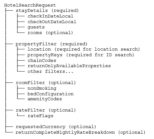 Request Structure: stayDetails (when/who) + propertyFilter (where) + optional filters (what kind)