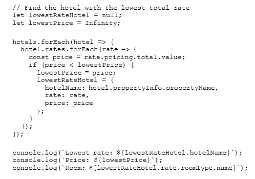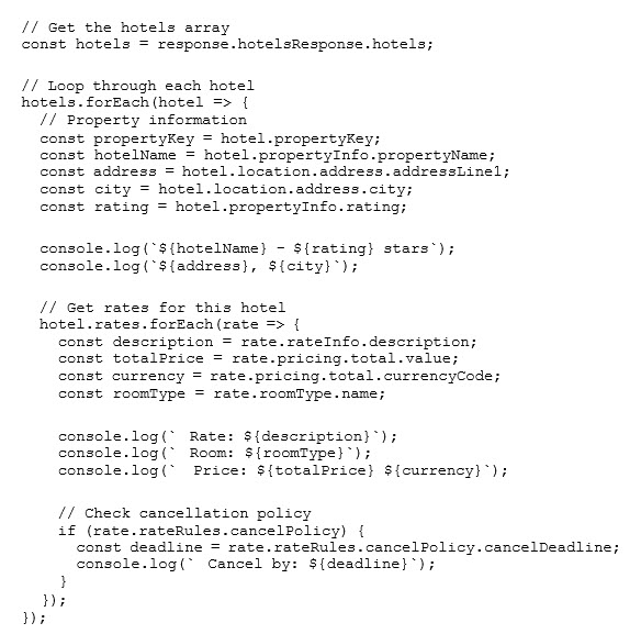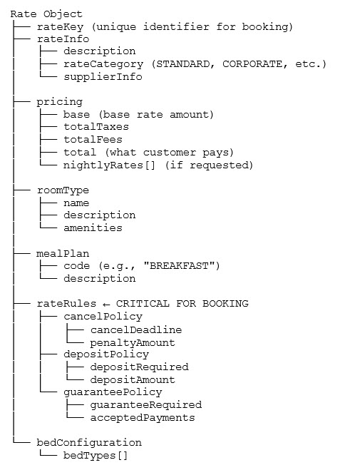 Response Structure: hotels[] contains properties, each with rates[], each rate has pricing and rateRules
