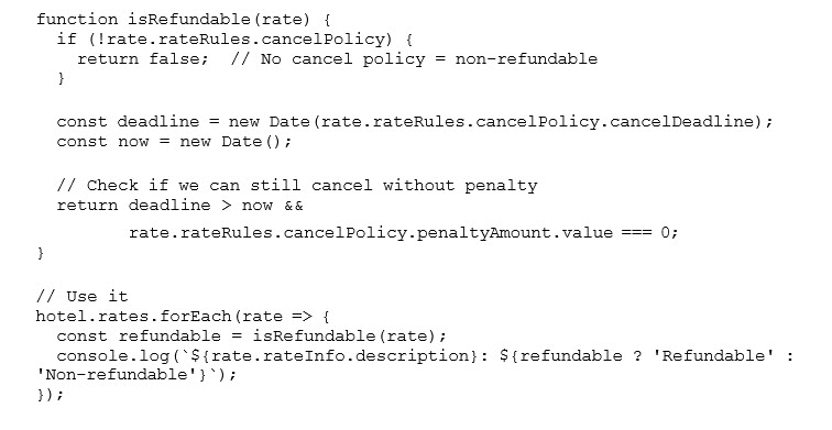 Not checking rateRules: Always check rateRules.cancelPolicy and rateRules.depositPolicy before displaying rates to users. Showing a rate without cancellation details can lead to customer complaints.