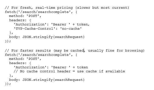 Using cached data for final booking: Before booking, make a fresh search with TVP-Cache-Control: no-cache to get current pricing.