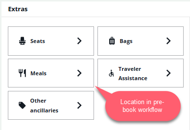 When selecting before booking, these options are located in the Extras panel . Passenger information must be included in the Booking File in order to select prior to booking.