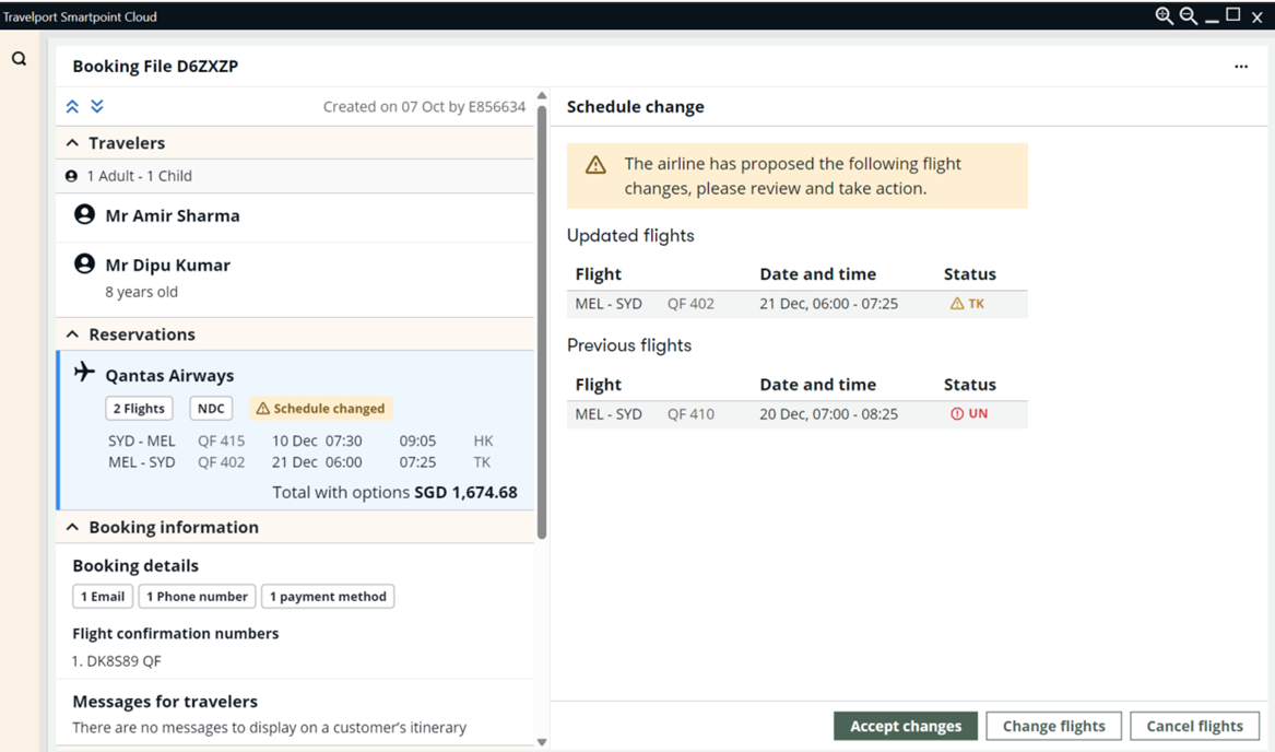 2. The booking file displays with a Schedule changed warning in the Reservation information. Schedule change information displays on the right panel, with UN segment status for the original flight which is no longer operating and TK segment status for the new flight the customer is re-accommodated on.