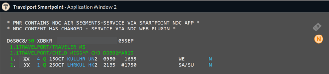 For agents on the latest Smartpoint Desktop version (11.7.1.24), a new indicator ā€œNā€ displays at the end of the booked NDC flight segment, in the same location as the guarantee * as is for EDIFACT today.