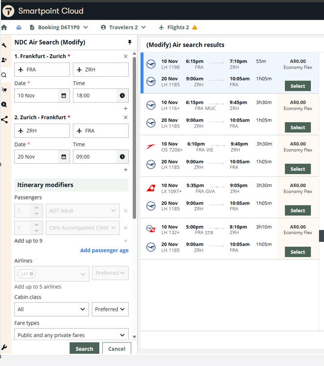 3. The NDC Air Search (Modify) panel on the left is pre-populated with the current flights. Change the date/time for the undesired flight to something more suitable.