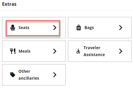 • If you are adding seats after ticketing, select the Reservation section, then scroll down on the right panel to the Add extras section under the itinerary information and select the + icon.