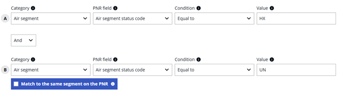 Note: If this behavior is not desired for scenarios where a PNR contains both HX and UN segments, configure a Trigger Group to identify such PNRs and handle them using a separate, tailored action.