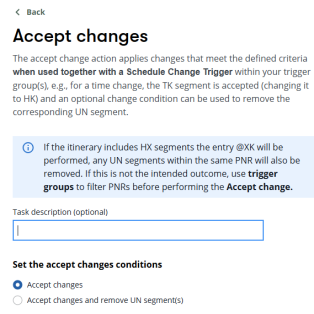 Accept changes and remove UN segment(s) accept changes and removes any canceled (UN) segments, as UN segments cannot be changed to confirmed (HK) segments and must be removed from the PNR.