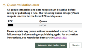 If any category is inactive or missing, the system displays a validation message when the user attempts to save or publish the rule. The notification includes a table listing the PCC, queue, category, and date ranges to help users quickly identify the issue. Users may then return to the Matched Actions and Failure Action steps to update the rule or temporarily dismiss the message while activating the category in Travelport+.