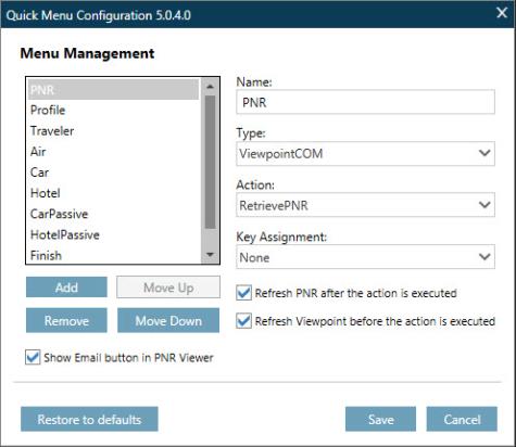 The Menu Management screen is displayed.  Use the appropriate buttons to Add, Remove, or Reorder the actions/functions.