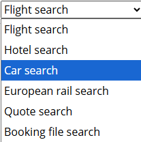 Enter the location, pick-up, drop-off dates and times and optional car rental company and car size and press search. Some details will be pre-populated if flight segments exist within the reservation (date, time, and pick-up fields). City codes can be used as pick-up and drop-off locations for car rental searches. When a city code is chosen, a location list displays for you to choose a rental location.
