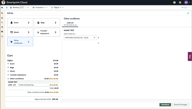If you book an option, the Extras screen is displayed to add ancillary services. When there are no names yet in your booking, a window will prompt for you to add the names of the passenger(s). More details can be found in the ancillaries services section. To complete your reservation, press Continue.