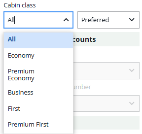 Cabin class, like airline selection, allows for Preferred or Only options. If you do not select a preference, the results will be in price order. Once the results are returned, you can compare different cabin classes and perks and make your selection.