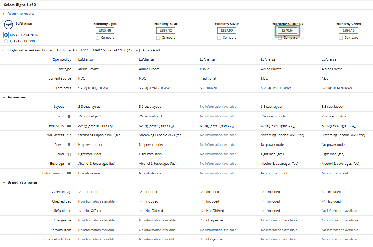 The available brands display. To select a different brand, select the price button for that brand. It is recommended to select the same brand for all flights, as mixed brands do not always combine.