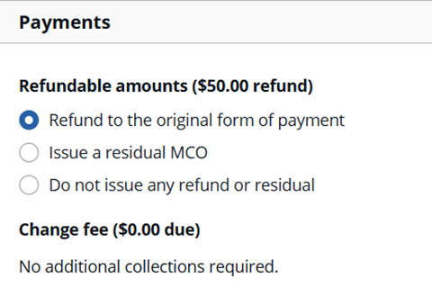 If the total cost to change the trip indicates a refund scenario (i.e., negative amount), then the Payments section will show the following options:
