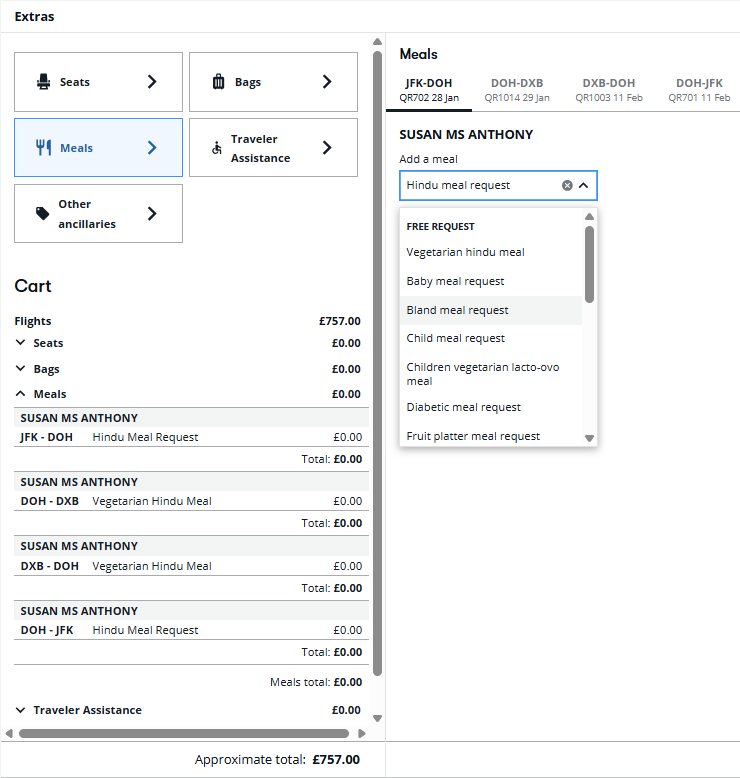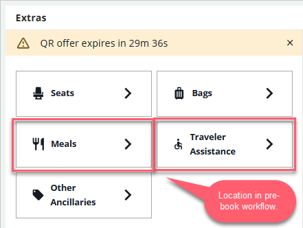 Free and paid meals and traveler assistance can be added before booking (NDC only), where supported by carrier.