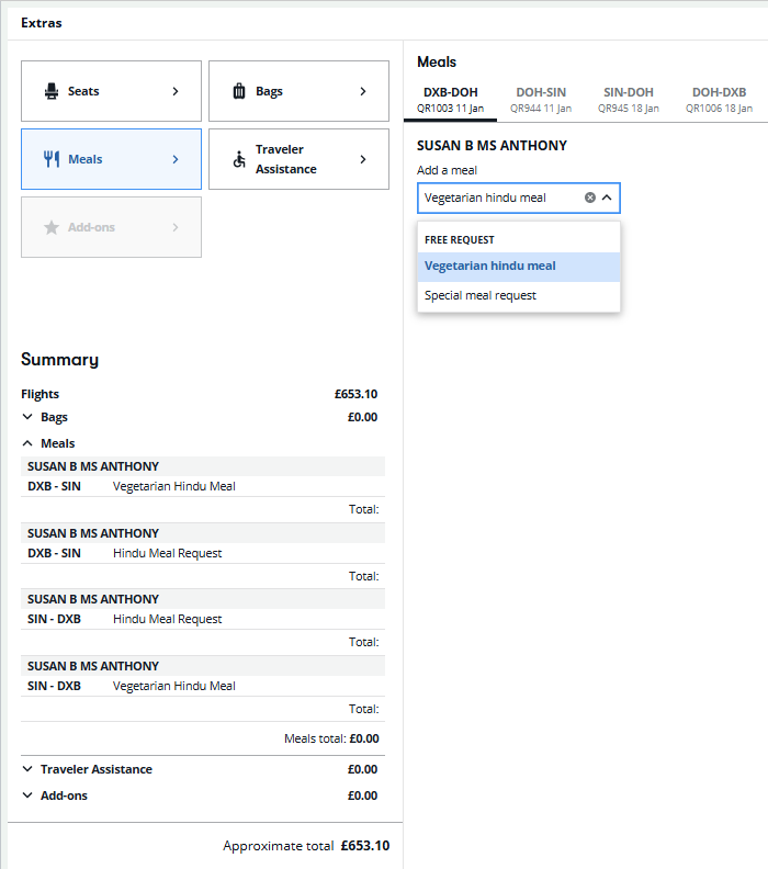 Special meal requests can be added per passenger and per segment before booking. At this time, Special Service Requests (SSRs) cannot be modified or canceled.