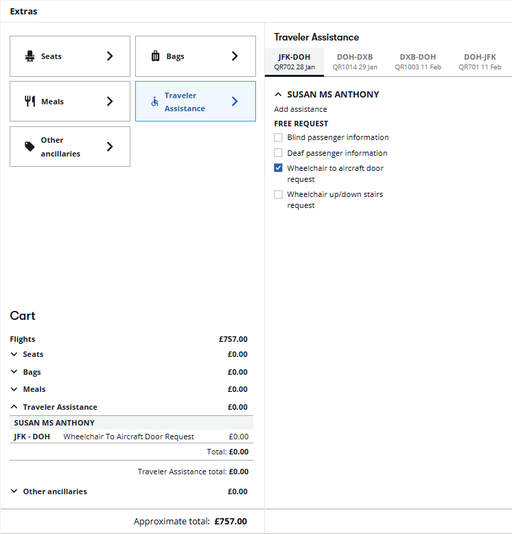 Traveler Assistance SSRs do not need to be added per segment. Any selection for a passenger applies to all segments in the NDC booking for that passenger. Multiple Special Assistance SSRs can be added and saved in a single request.