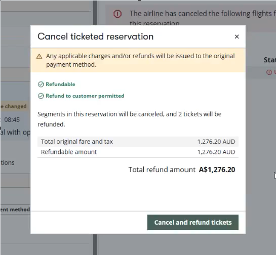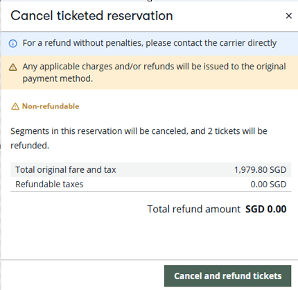 Note: Certain airlines do not support rebooking NDC flights after flight disruption with penalties waived. If this is the case, the refundable amount will not be equal to the original fare and taxes, and a warning banner displays advising the user they need to contact the airline directly for refund without penalties. Close the Cancel and Refund window and contact the carrier for a refund request.