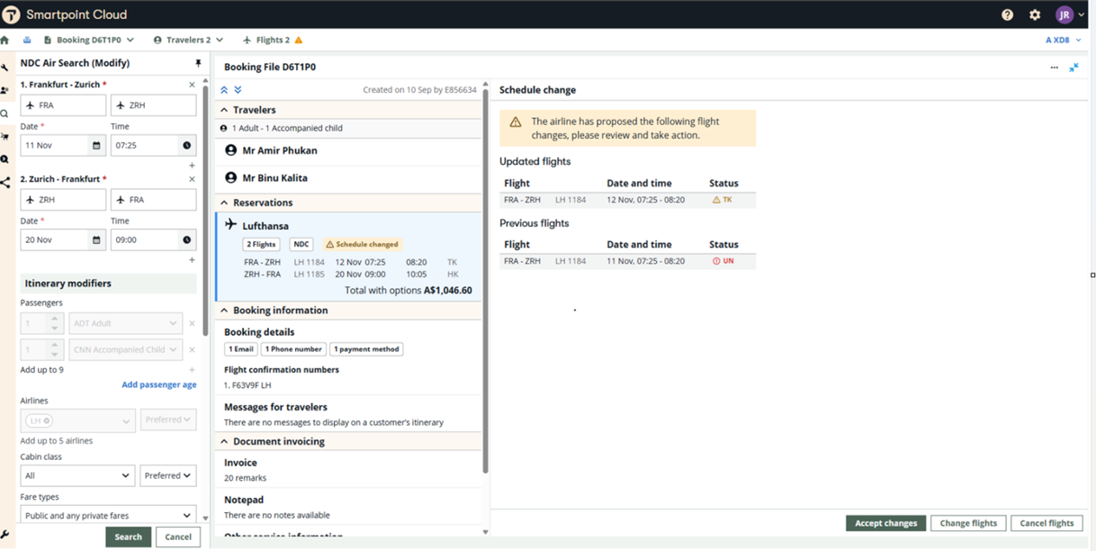 Important: Agents must accept, modify, or cancel the airline schedule change either by using Smartpoint Cloud or Smartpoint Desktop through the NDC capabilities within Flight Search.