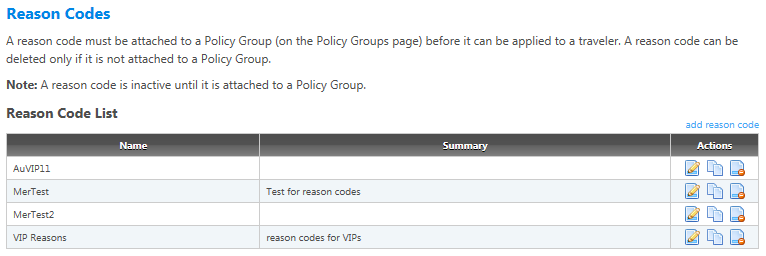 Note: A reason code is inactive until it is attached to a policy group. You apply a reason code to travelers on either the Add Policy Group or Edit Policy Group screen.