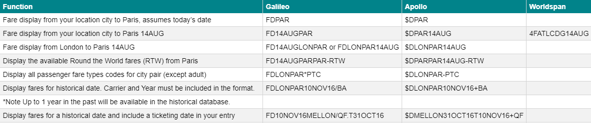 This page is intended to offer examples of the Fare Display function within Travelport GDSs. It is not a complete list but rather shows many of the most commonly used entries. For more formats see here.