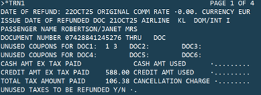 Display fill in format for full or partial refund. Format includes 3 digit airline code, electronic ticket number and date of ticket issued. The year is optional and can be added as 08APR24. Additional details for full refund are available here and for partial refund, here. |