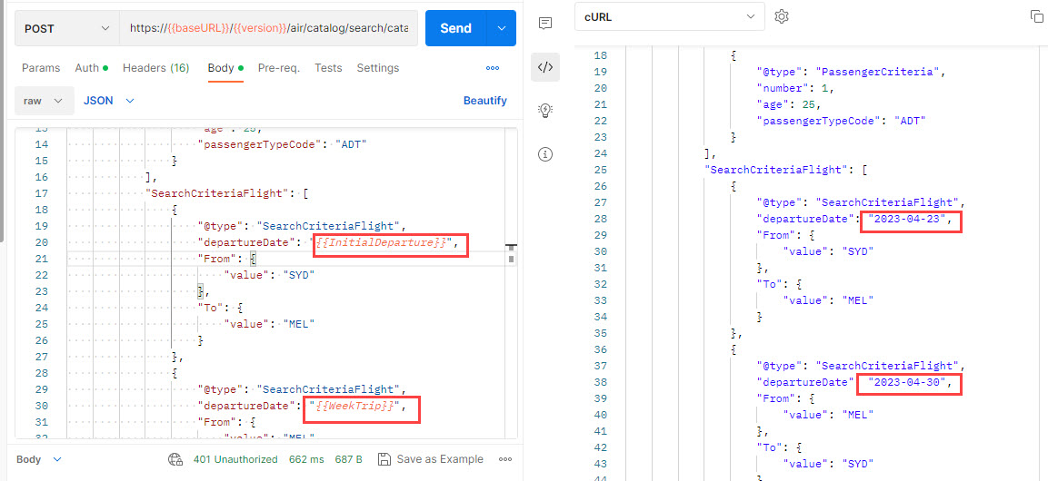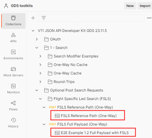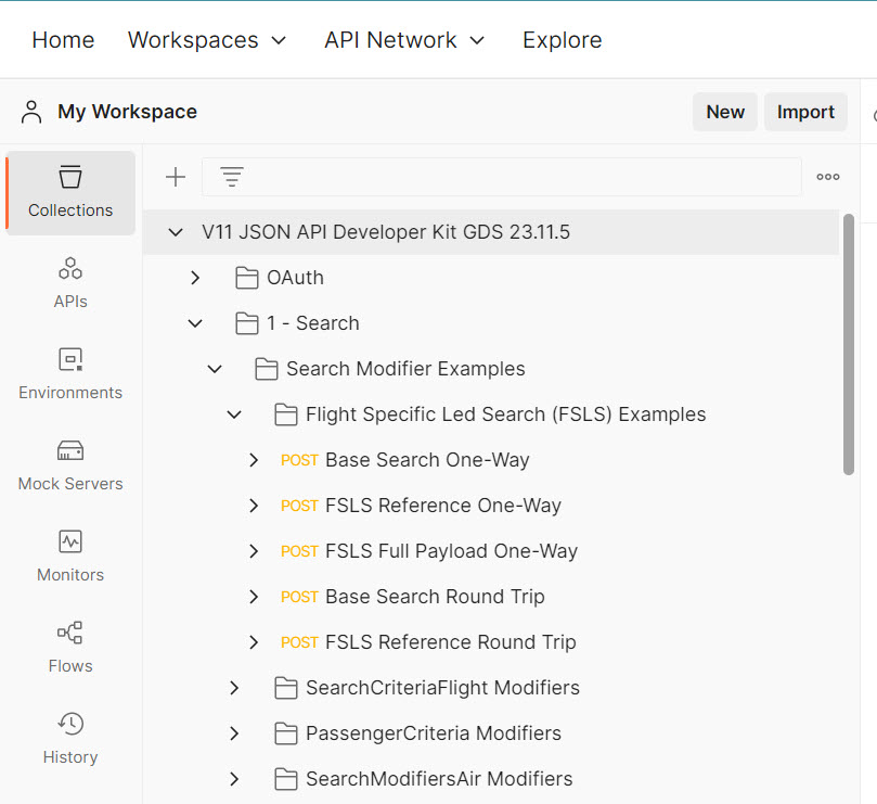All JSON API Postman collections are organized in folders and sub-folders that follow the workflow for that set of APIs. API requests with extensive options have multiple folders to showcase possible paths. For example, the following JSON Air Postman collection includes examples of Flight Specific Search for one way and round trip options.