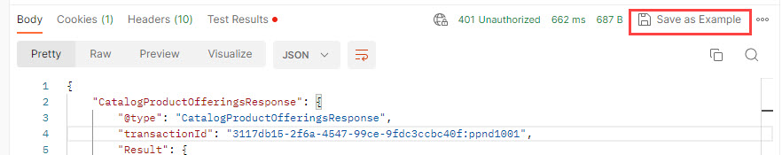 Some of the examples illustrate longer end-to-end flows that carry a specific scenario through all required API calls. In the example below, the first example highlighted with red is a standalone example, while the second highlight is part of an end-to-end (E2E) flow. This second scenario appears several times in this collection under the same example name.