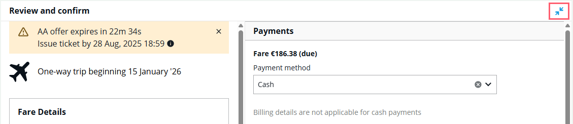 The review and confirm page displays. Once the information has been completed, choose to hold or ticket the itinerary in the graphical view.