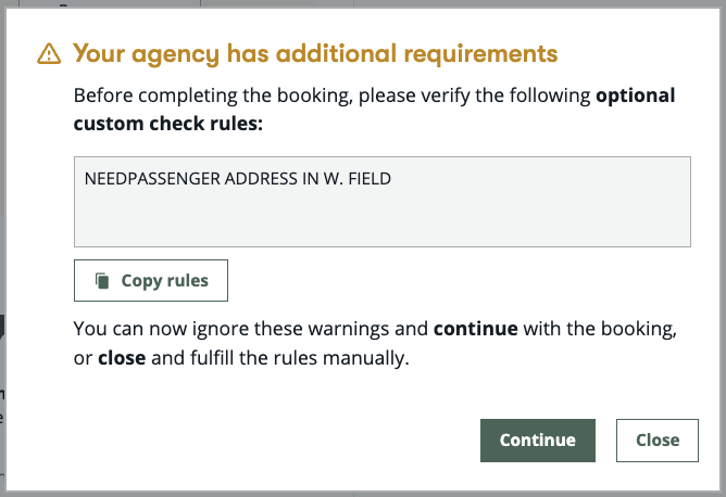 If a Custom Check rule is optional, an alert indicates which information is missing but the booking can continue without the missing information. Select Continue to continue booking the itinerary. Select Close to return to the review and confirm screen, where you can add missing information.