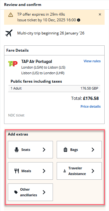 1. The Review and confirm panel displays fare and itinerary details. If commission information is available for an air offer, it displays in the Fare Details section. You can also add or modify seats, bags, and add-ons if supported by the carrier.