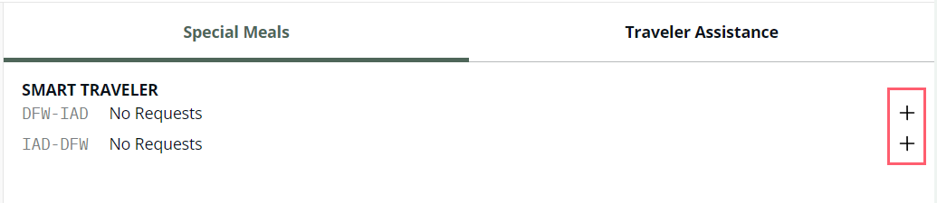 Select the + icon to expand the list of options for the special meal or traveler assistance.