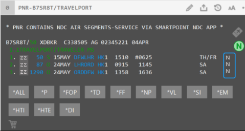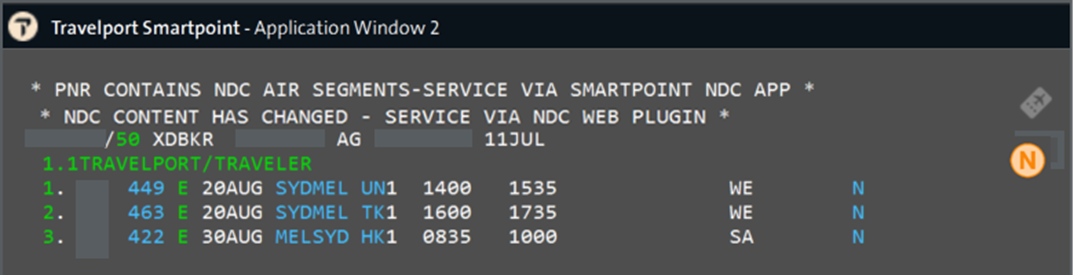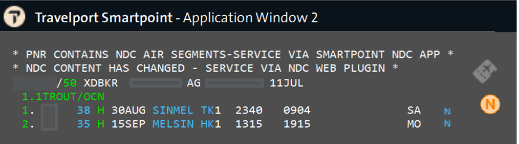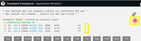 For agents on the latest Smartpoint Desktop version (11.7.1.24), a new indicator ā€œNā€ displays at the end of the booked NDC flight segment, in the same location as the guarantee * as is for EDIFACT today.