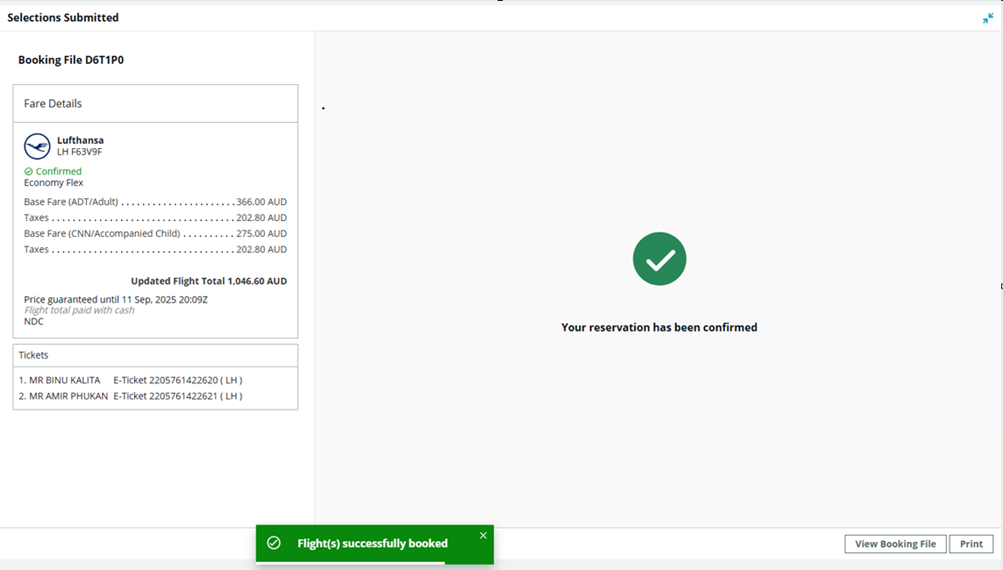 The confirmation screen displays, indicating that the new flights have been booked successfully. If the airline has reissued the ticket, the new tickets are displayed.