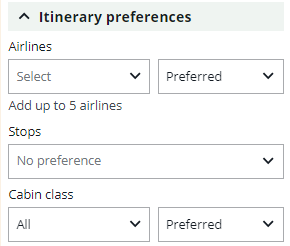 To filter results by airline, select up to 5 airlines, then choose whether these airlines are preferred, should only be returned, or should be excluded. When Preferred is selected, the airlines display first followed by other airlines.