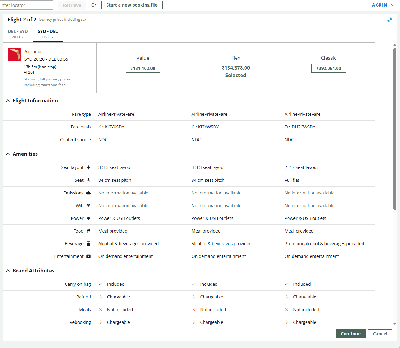 NDC and GDS air bookings cannot be in the same booking file at this time. If you have an open booking, ignore it before selecting Flight Search. Having NDC and GDS content in the same booking may result in mismatched data, errors, or canceled segments.