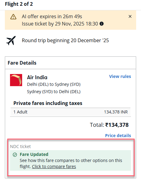 For Air India only, to view additional brands, a blue banner displays in the Review and confirm price details section and provides a link to a comparison matrix.