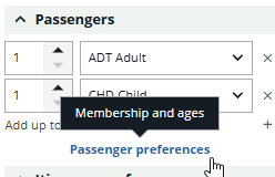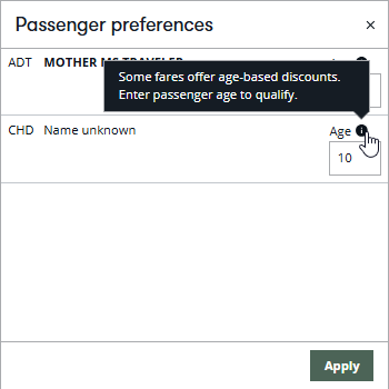 To add the ages of the passengers, select the Passenger preferences link beneath the passenger types. Some countries exempt passengers of a certain age from paying taxes, but ages are required. You do not have to enter ages for all passengers, only those that may qualify for a discount or tax exemption. Select Apply once ages have been added.