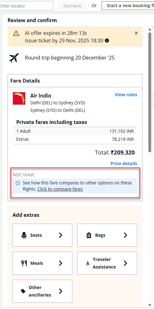 NDC offers are only available for a certain amount of time. If the booking is not completed in that time, the offer is no longer valid and will fail to book. The Review and confirm panel displays the offer time limit in local time in an orange box beneath the booking total. UTC (Zulu) time displays when hovering over the information