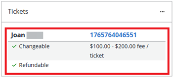 In the Ticket card, change and refund eligibility displays below the passenger name and ticket number.