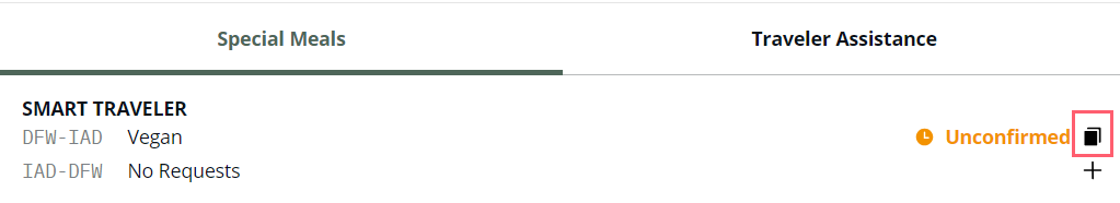 Select the + icon to expand the list of options for the special meal or traveler assistance.