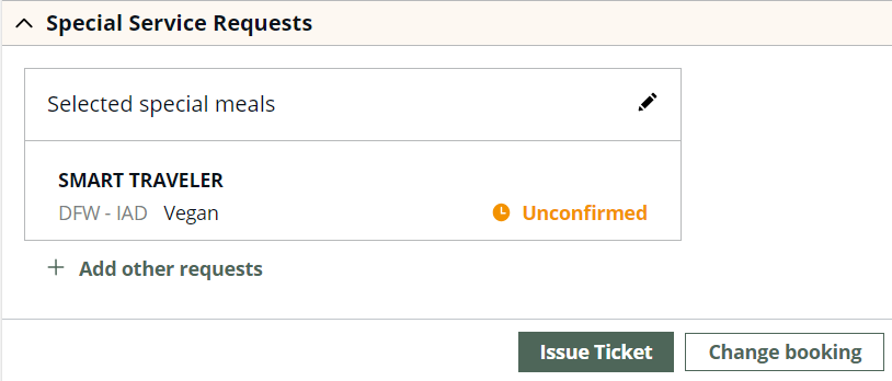 Status of the requested SSR is updated by the carrier— agents will see this upon subsequent retrieval of the Booking File. Status starts with Unconfirmed, meaning the carrier has not yet responded to the request. This status might be changed at any point by the carrier. Depending on the carrier response, the status will show as either Confirmed (green), or Rejected (red). If the SSR is rejected, the request may not be supported by the carrier or the carrier has rejected it and deleted it from the Booking File. If further assistance is needed with rejected SSRs, please contact the carrier directly.
